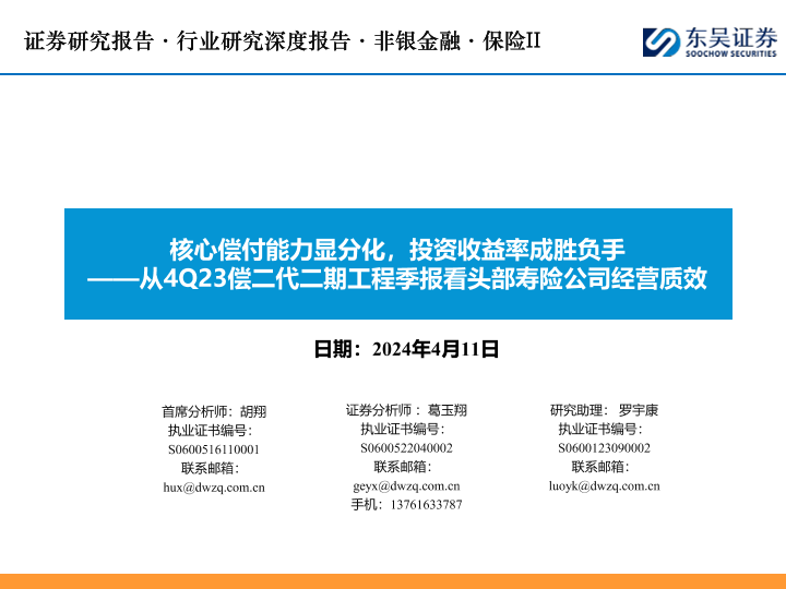 【东吴证券】【20240411】非银金融行业从4Q23偿二代二期工程季报看头部寿险公司经营质效:核心偿付能力显分化,投资收益率成胜负手-63页