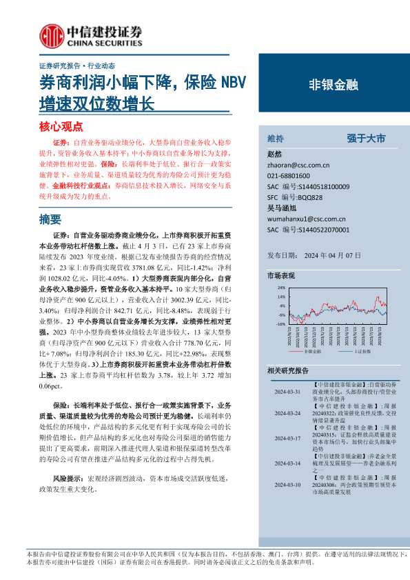 【中信建投证券】【20240407】非银金融行业:券商利润小幅下降,保险NBV增速双位数增长-22页