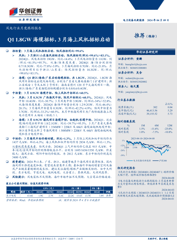 【华创证券】【20240409】风电行业月度跟踪报告:Q1+1.8GW海缆招标,3月海上风机招标启动-10页