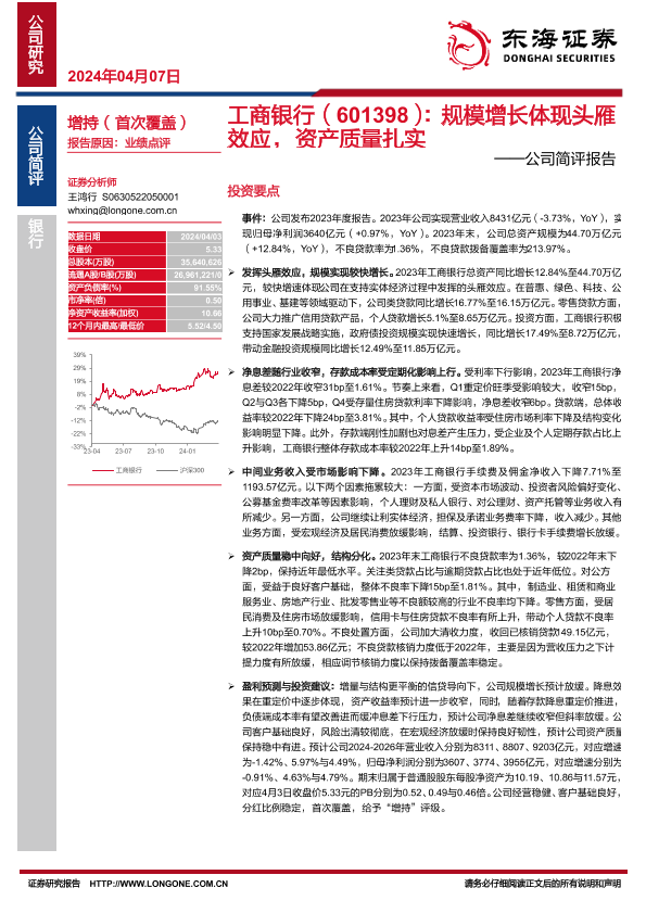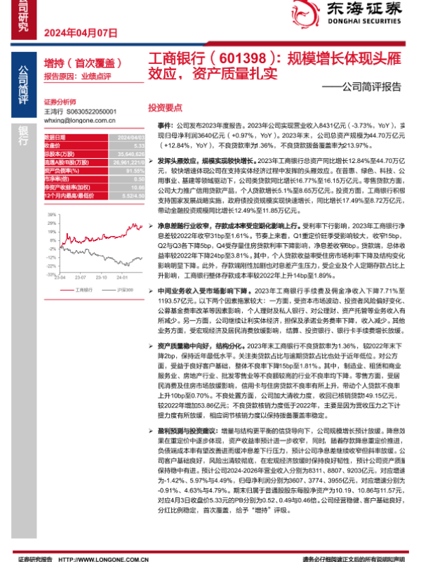 【东海证券】【20240407】工商银行(601398):规模增长体现头雁效应,资产质量扎实——公司简评报告-14页