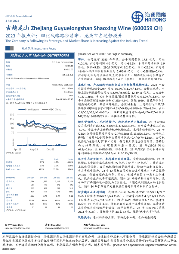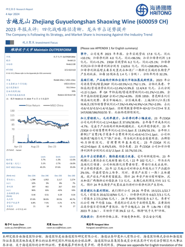【海通国际】【20240404】古越龙山-2023年报点评:四化战略路径清晰,龙头市占逆势提升-13页