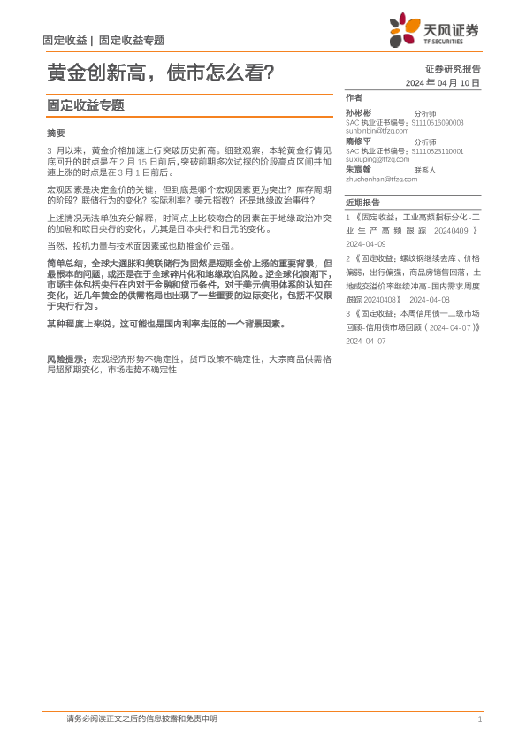 【天风证券】【20240410】固定收益专题:黄金创新高,债市怎么看?-17页