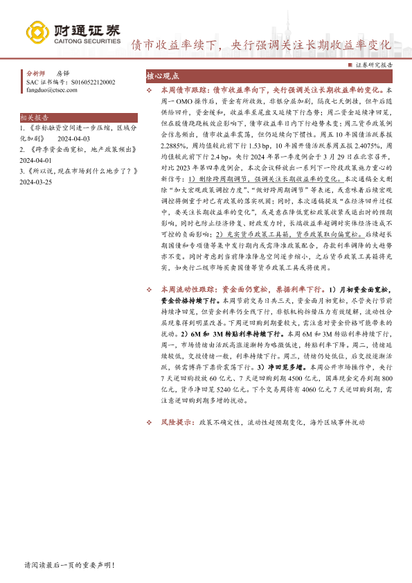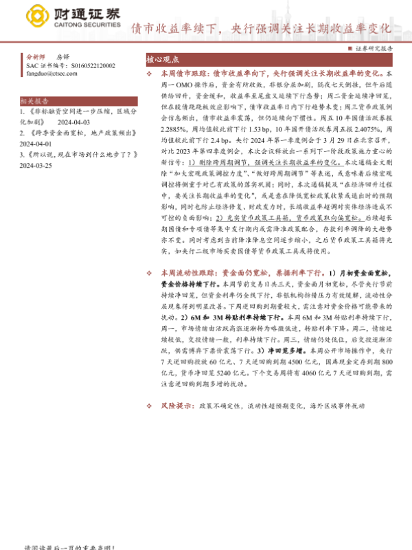 【财通证券】【20240407】固收定期报告:债市收益率续下,央行强调关注长期收益率变化-16页