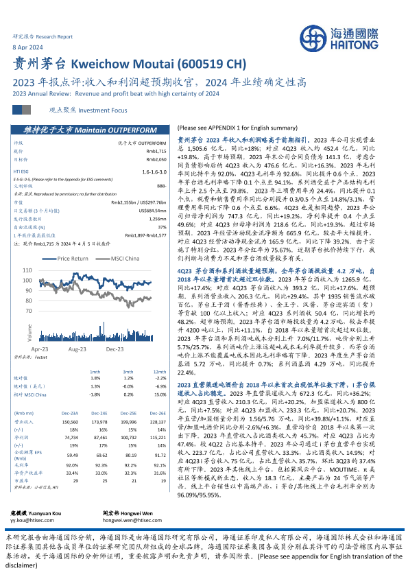 【海通国际】【20240408】贵州茅台-600519.SH-2023年报点评:收入和利润超预期收官,2024年业绩确定性高-13页