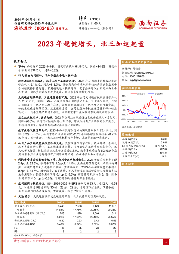 【西南证券】【20240401】海格通信-2023年稳健增长,北三加速起量-16页