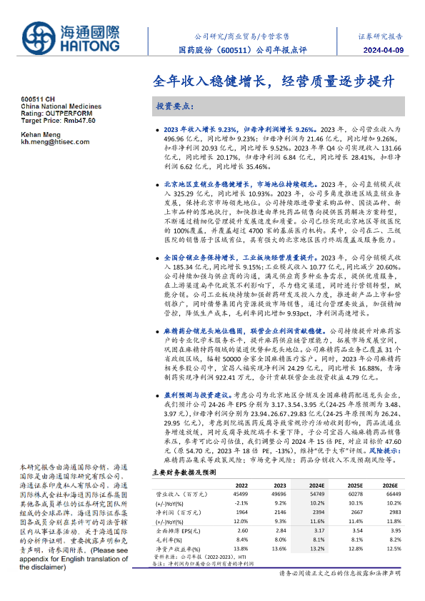 【海通国际】【20240406】国药股份-600511.SH-公司年报点评:全年收入稳健增长,经营质量逐步提升-11页