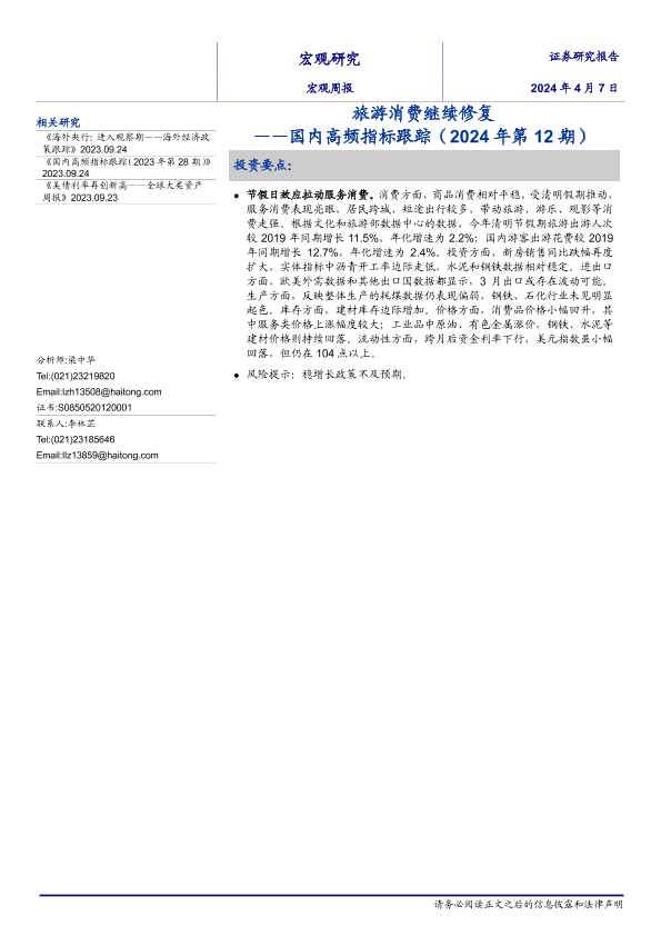 【海通证券】【20240407】国内高频指标跟踪(2024年第12期):旅游消费继续修复-13页