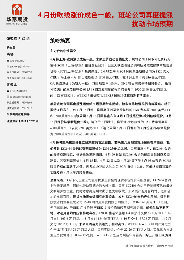 【华泰期货】【20240407】航运月报:4月份欧线涨价成色一般,班轮公司再度提涨扰动市场预期-22页