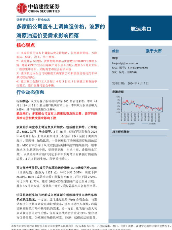 【中信建投证券】【20240407】航运港口行业:多家船公司宣布上调集运价格,波罗的海原油运价受需求影响回落-27页