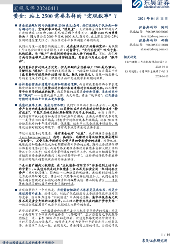 【东吴证券】【20240411】黄金,站上2500需要怎样的“宏观叙事”?-10页