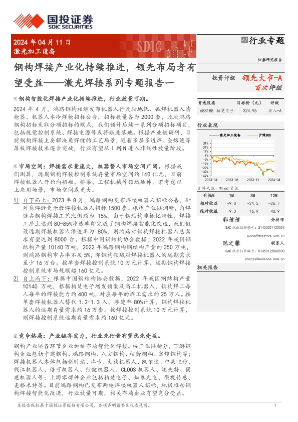 【国投证券】【20240411】激光加工设备行业激光焊接系列专题报告一:钢构焊接产业化持续推进,领先布局者有望受益-12页