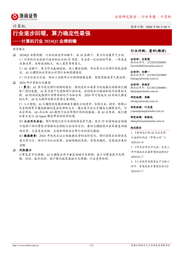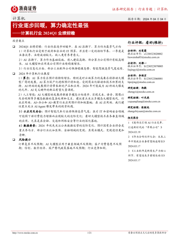 【浙商证券】【20240404】计算机行业2024Q1业绩前瞻:行业逐步回暖,算力确定性最强-21页