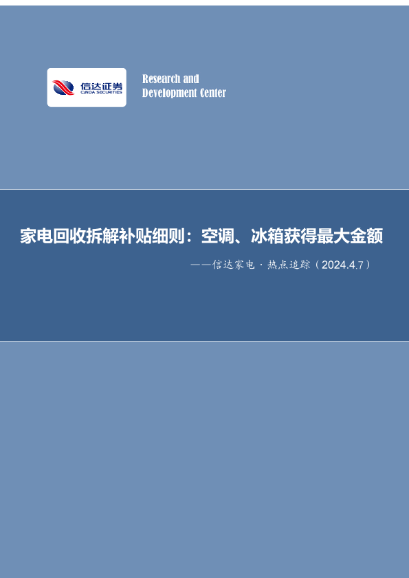 【信达证券】【20240407】家电行业·热点追踪:家电回收拆解补贴细则,空调、冰箱获得最大金额-13页