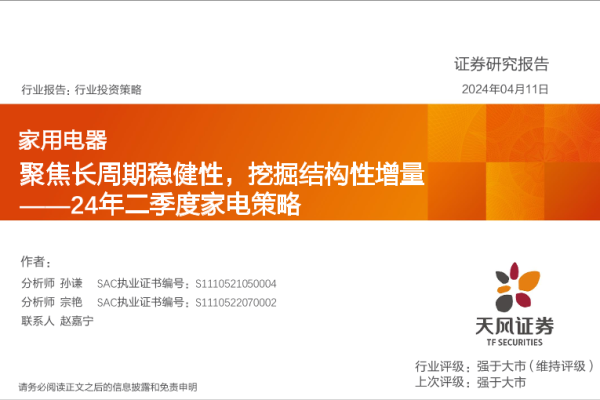 【天风证券】【20240411】家用电器行业24年二季度家电策略:聚焦长周期稳健性,挖掘结构性增量-46页