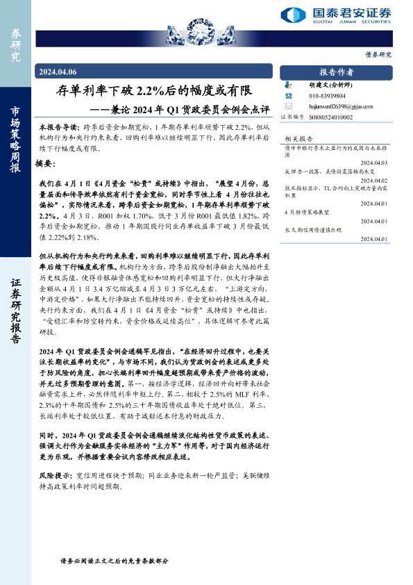 【国泰君安证券】【20240406】兼论2024年Q1货政委员会例会点评:存单利率下破2.2%后的幅度或有限-11页