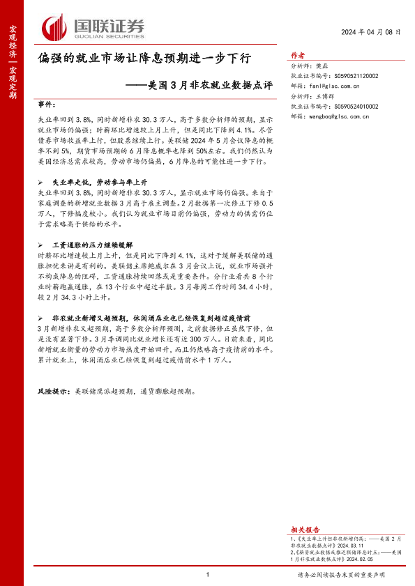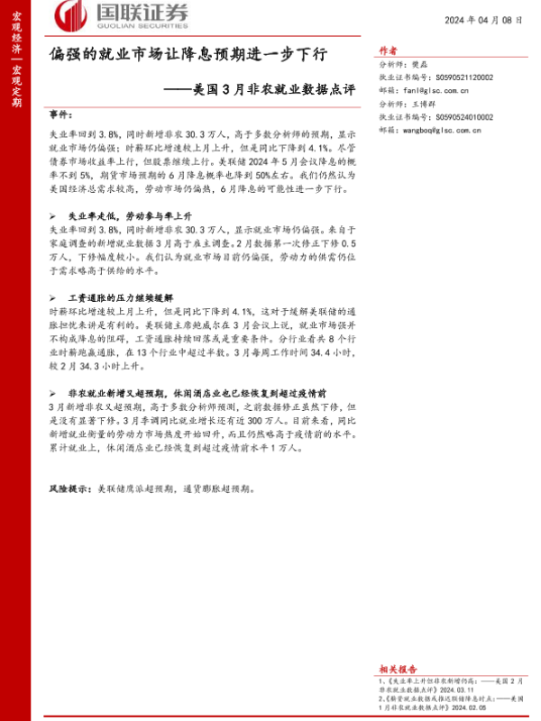 【国联证券】【20240408】美国3月非农就业数据点评:偏强的就业市场让降息预期进一步下行-24页