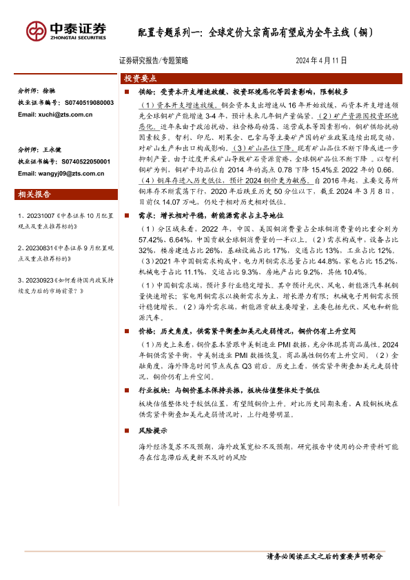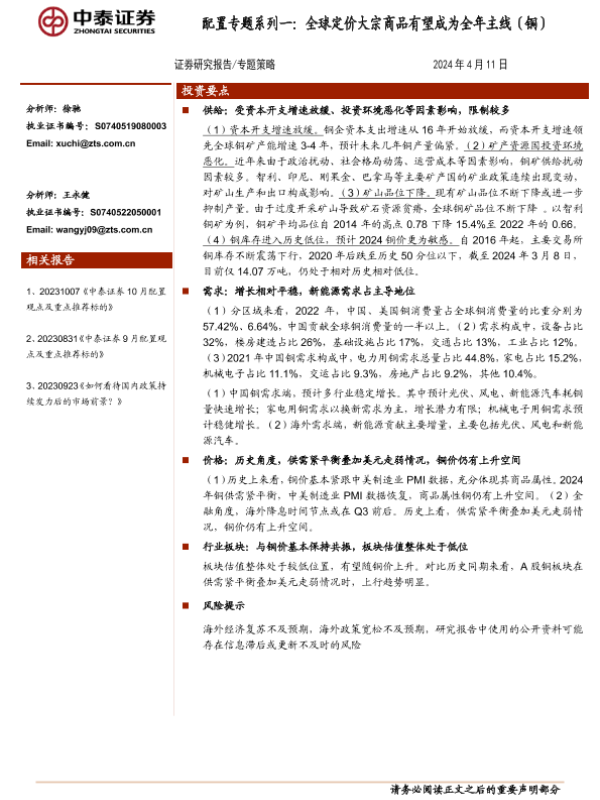 【中泰证券】【20240411】配置专题系列一:全球定价大宗商品有望成为全年主线(铜)-13页