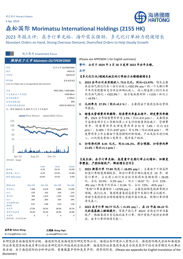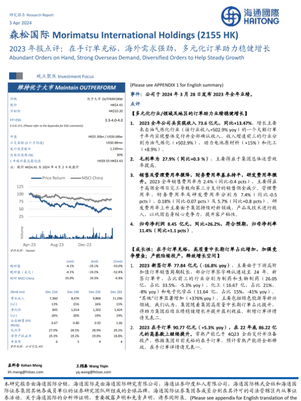 【海通国际】【20240403】森松国际(2155.HK)2023年报点评:在手订单充裕,海外需求强劲,多元化订单助力稳健增长-16页