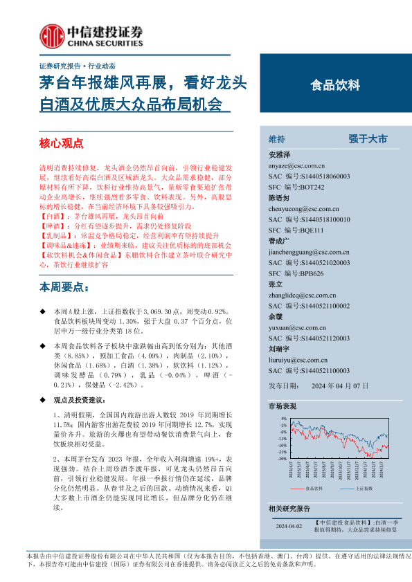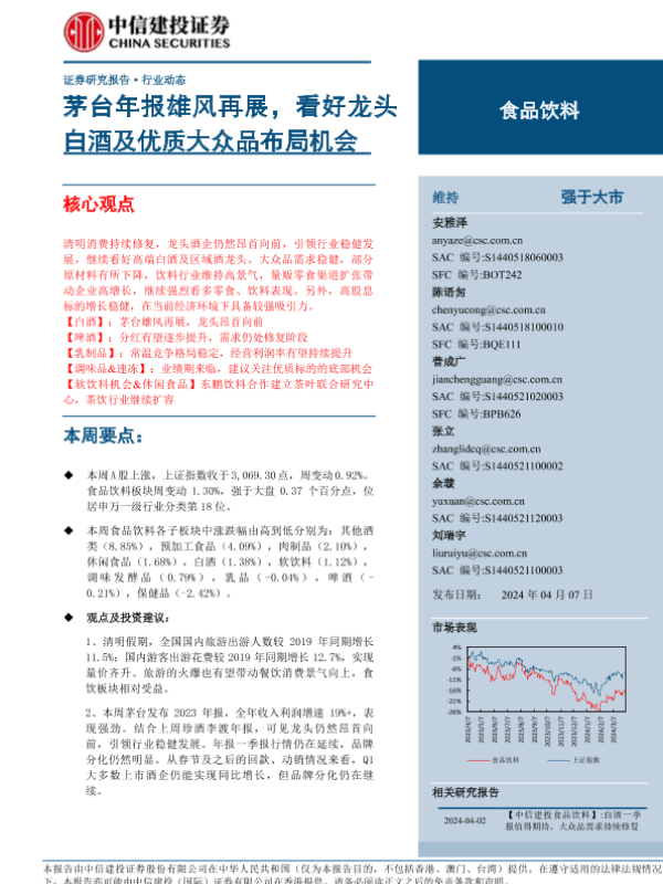 【中信建投证券】【20240407】食品饮料行业:茅台年报雄风再展,看好龙头白酒及优质大众品布局机会-31页