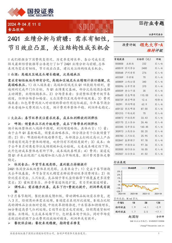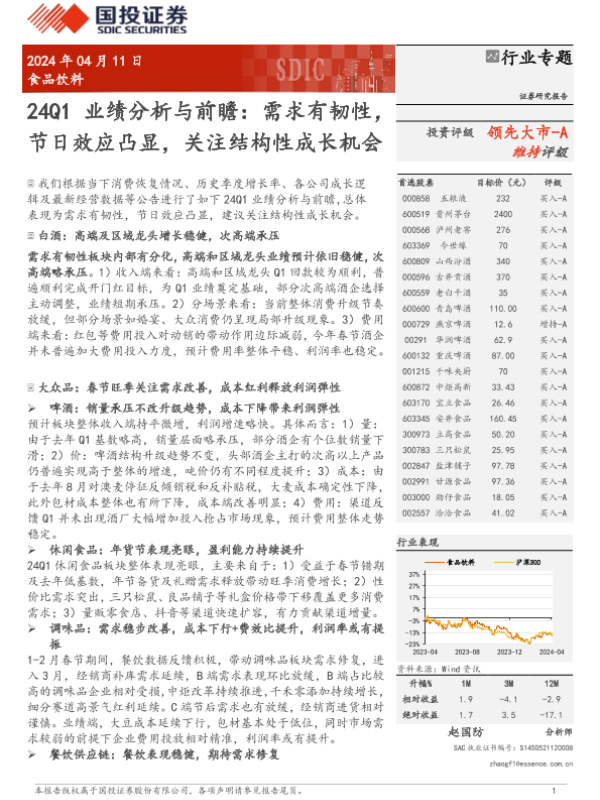 【国投证券】【20240411】食品饮料行业24Q1业绩分析与前瞻:需求有韧性,节日效应凸显,关注结构性成长机会-11页