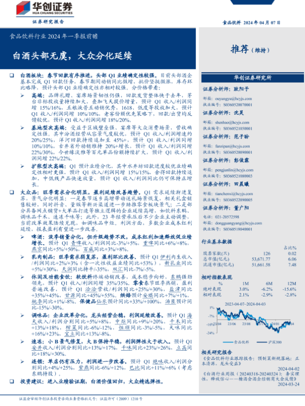 【华创证券】【20240407】食品饮料行业2024年一季报前瞻:白酒头部无虞,大众分化延续-20页