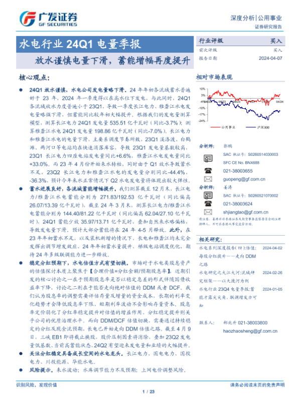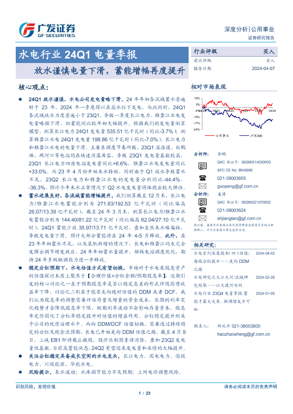 【广发证券】【20240407】水电行业24Q1电量季报:放水谨慎电量下滑,蓄能增幅再度提升-23页