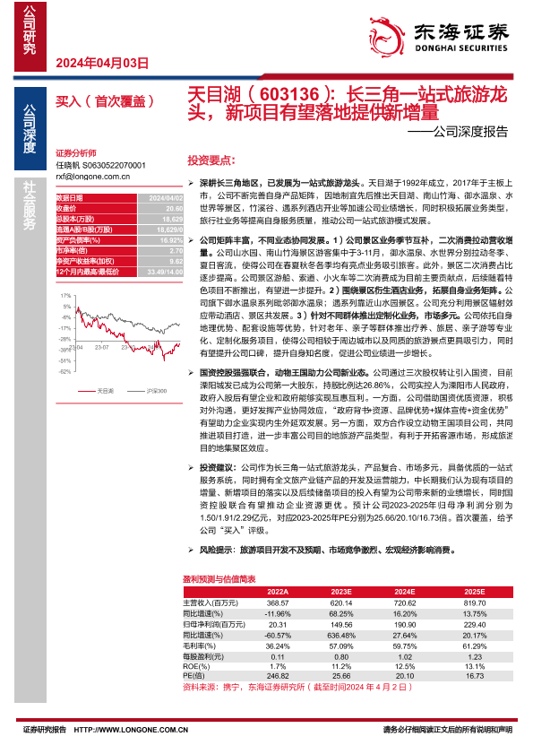 【东海证券】【20240403】天目湖-603136.SH-公司深度报告:长三角一站式旅游龙头,新项目有望落地提供新增量-21页