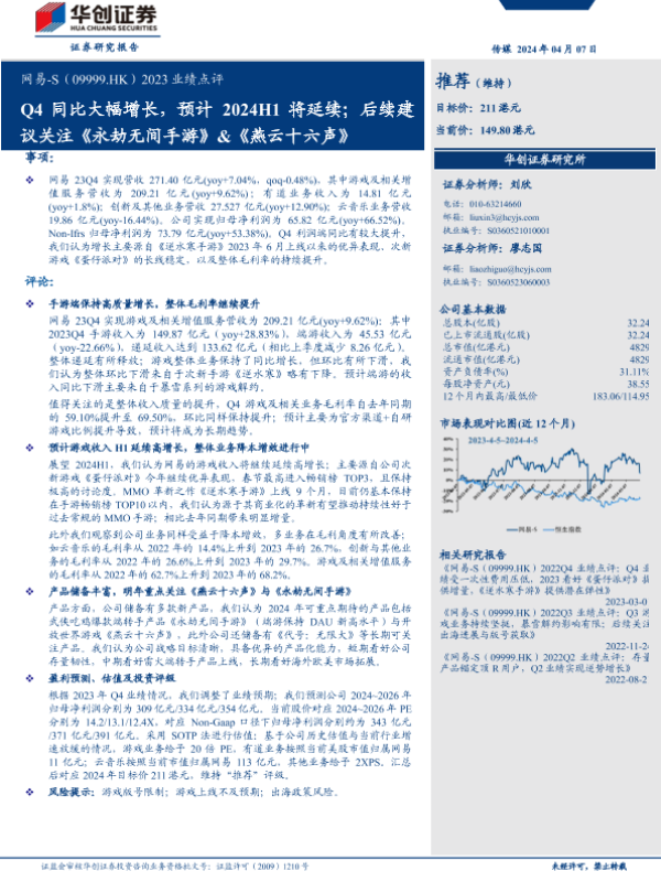 【华创证券】【20240407】99.HK)2023业绩点评:Q4同比大幅增长,预计2024H1将延续;后续建议关注《永劫无间手游》&《燕云十六声》-15页