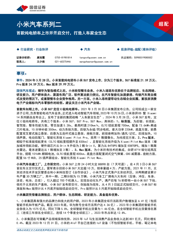 【国信证券】【20240407】小米汽车系列二:首款纯电轿车上市并开启交付,打造人车家全生态-10页