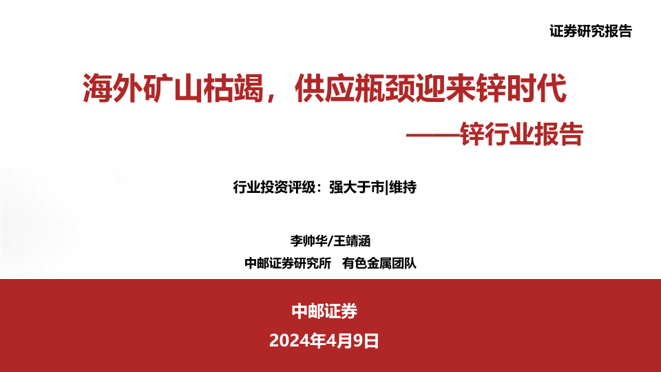 【中邮证券】【20240409】锌行业报告:海外矿山枯竭,供应瓶颈迎来锌时代-35页