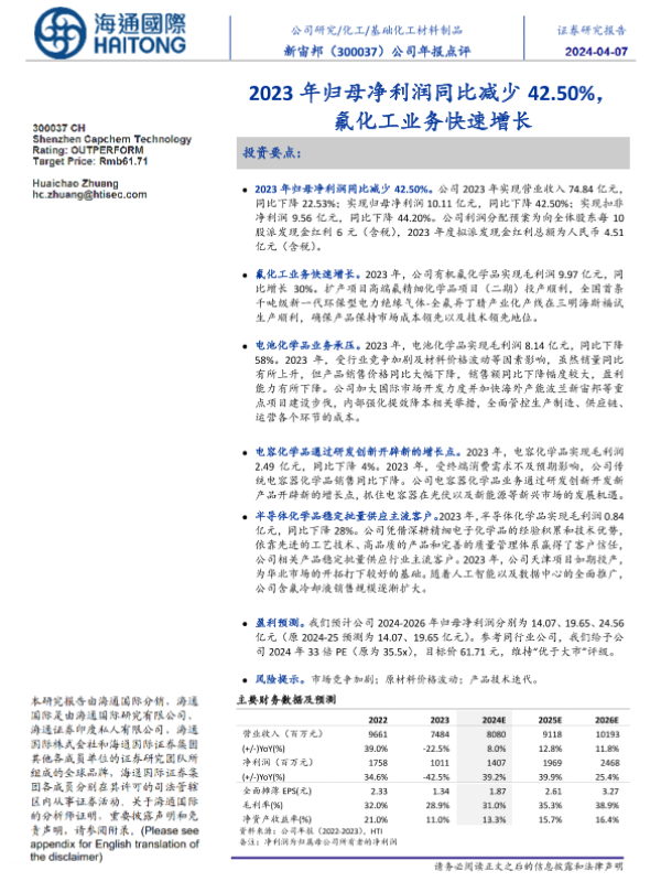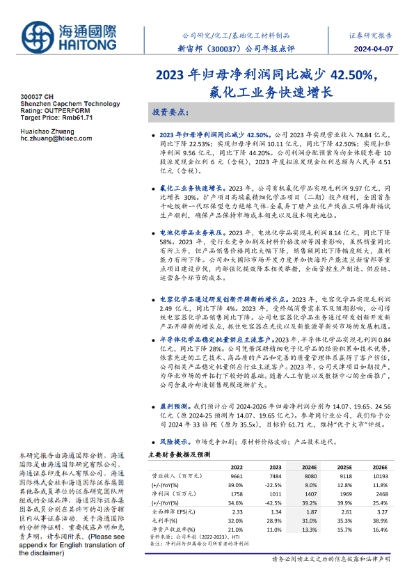 【海通国际】【20240407】新宙邦-300037.SZ-公司年报点评:2023年归母净利润同比减少42.50%,氟化工业务快速增长-12页