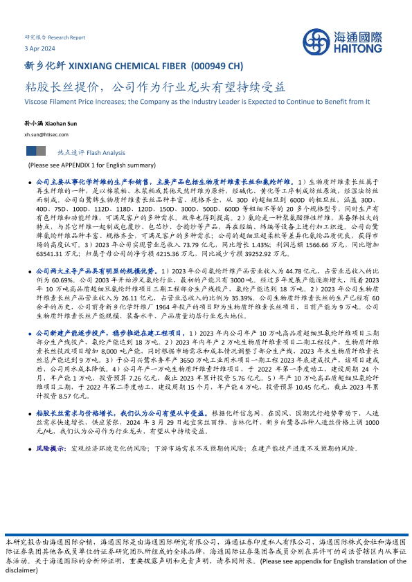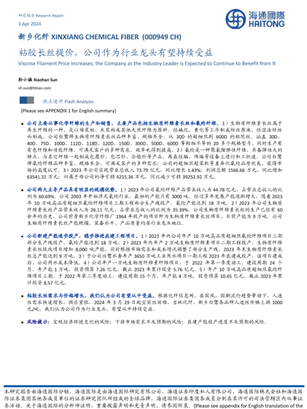 【海通国际】【20240403】新乡化纤-粘胶长丝提价,公司作为行业龙头有望持续受益-13页