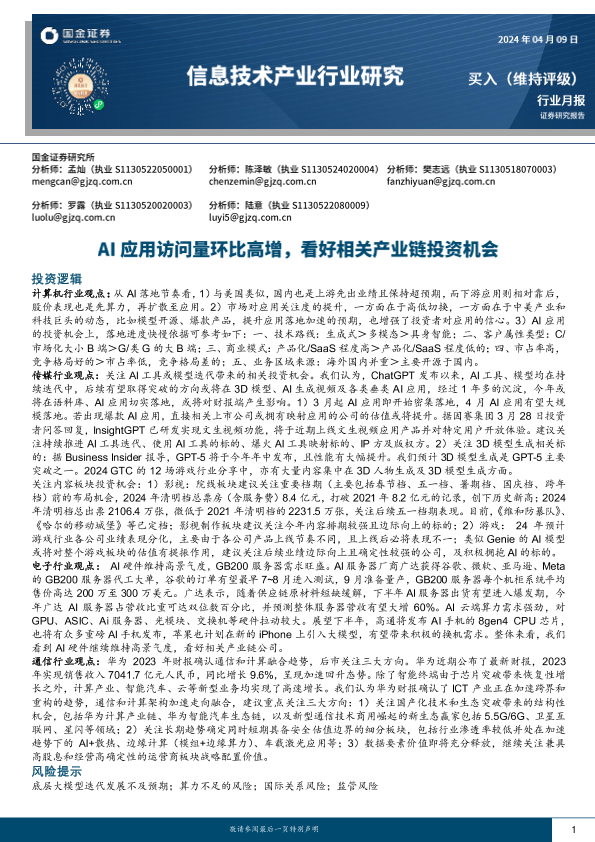 【国金证券】【20240409】信息技术产业行业月报:AI应用访问量环比高增,看好相关产业链投资机会-16页