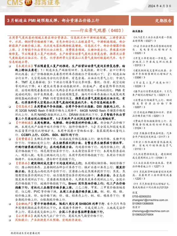 【海通证券】【20240403】行业景气观察(0403):3月制造业PMI超预期反弹,部分资源品价格上行-32页