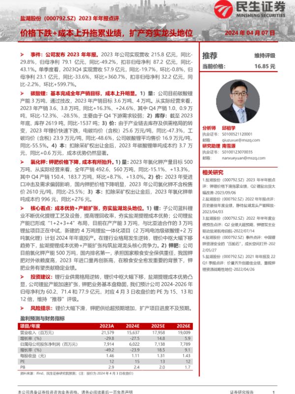 【民生证券】【20240407】盐湖股份-000792.SZ-2023年年报点评:价格下跌+成本上升拖累业绩,扩产夯实龙头地位-14页