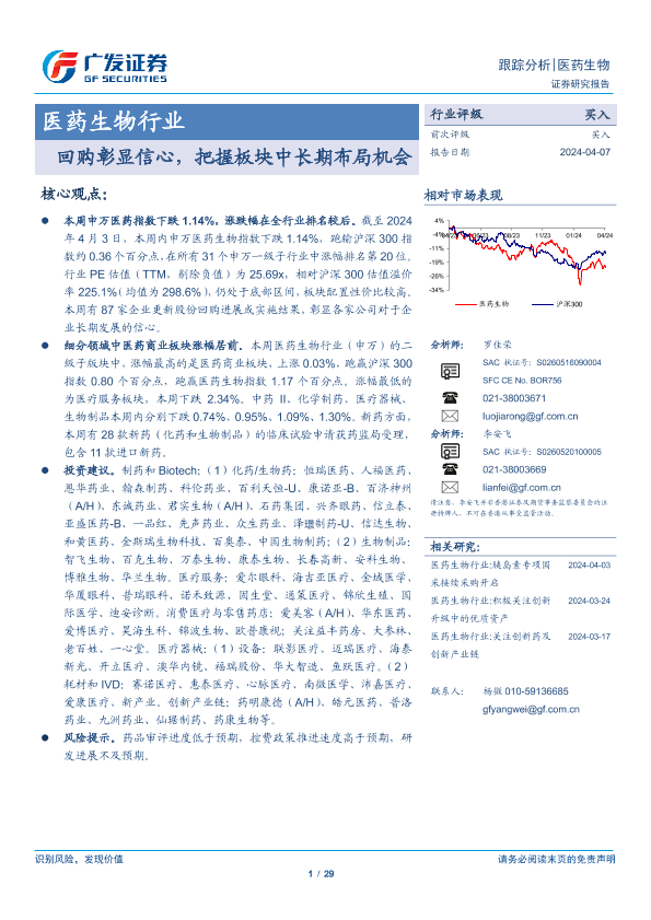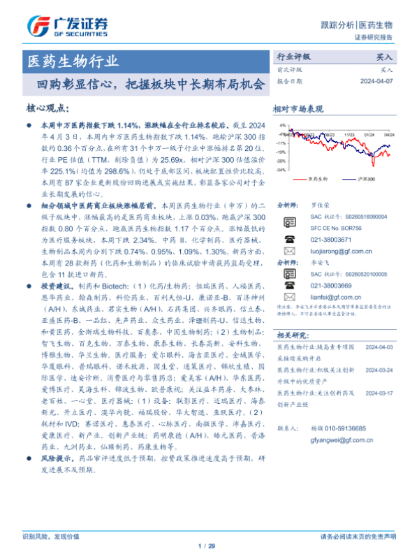 【广发证券】【20240407】医药生物行业:回购彰显信心,把握板块中长期布局机会-29页