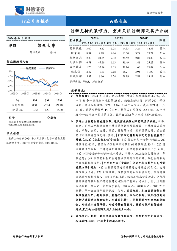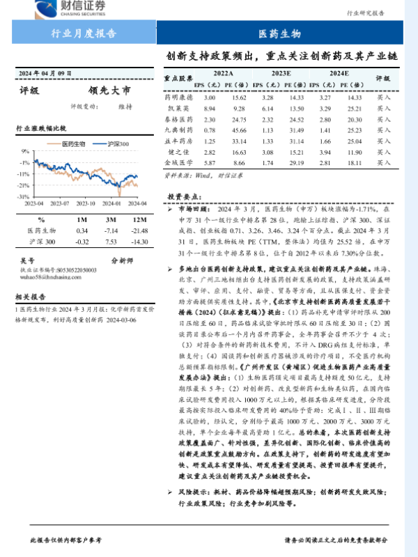 【财信证券】【20240409】医药生物行业月度报告:创新支持政策频出,重点关注创新药及其产业链-15页