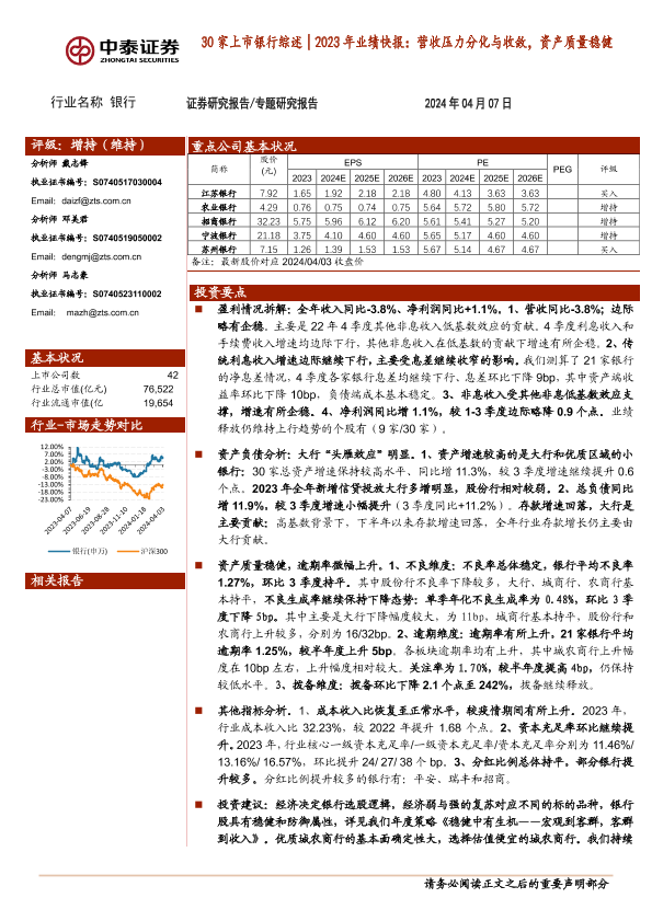 【中泰证券】【20240407】银行业30家上市银行综述│2023年业绩快报:营收压力分化与收敛,资产质量稳健-29页