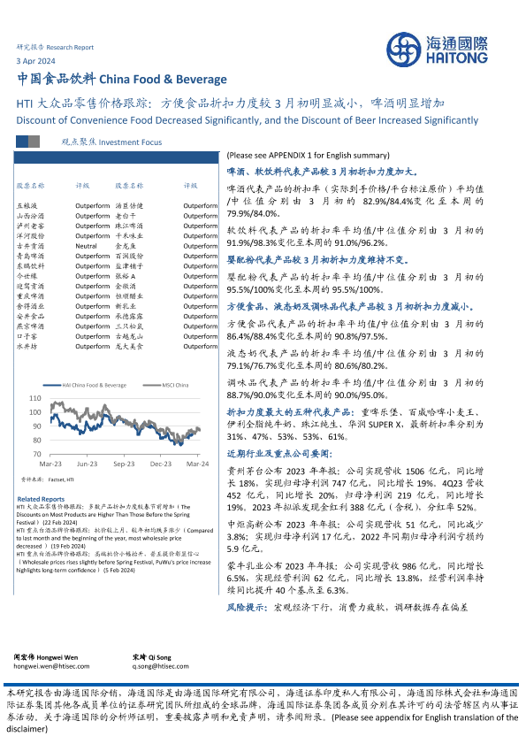 【海通国际】【20240403】中国食品饮料行业:HTI大众品零售价格跟踪,方便食品折扣力度较3月初明显减小,啤酒明显增加-11页