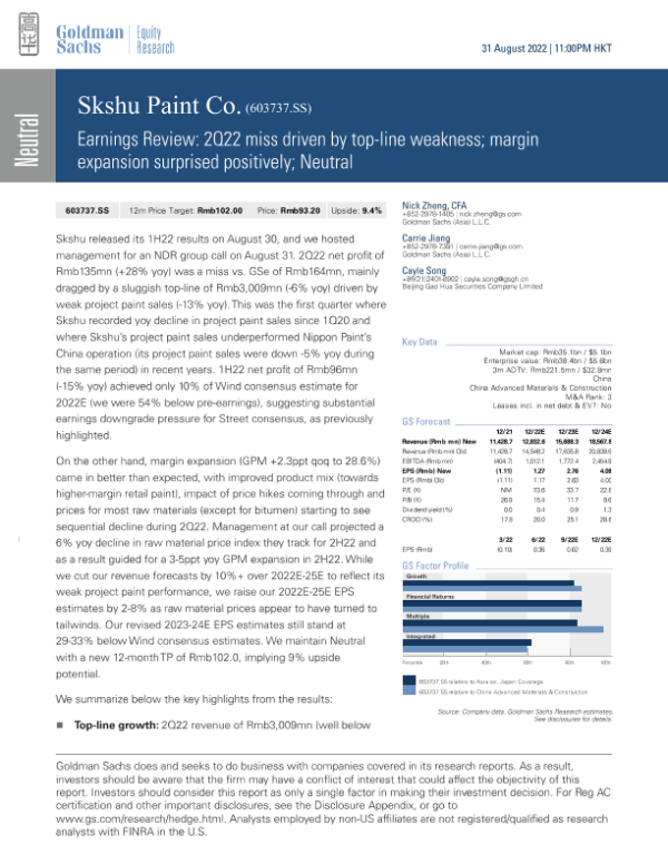 【Goldman Sachs】【20220831】Skshu Paint Co. 2Q22 earnings review Driven by top-line weakness; margin expansion surprised positively; Neutral-9页