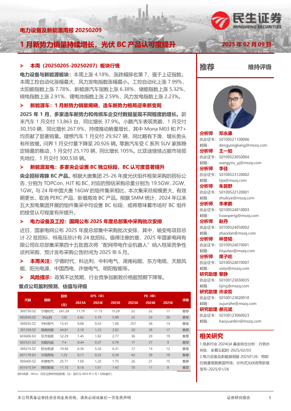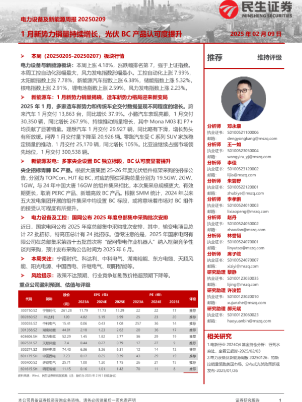 【民生证券】【20250209】电力设备及新能源周报:1月新势力销量持续增长,光伏BC产品认可度提升-26页