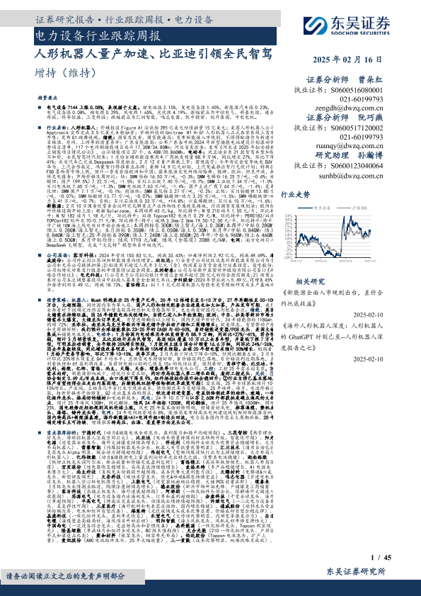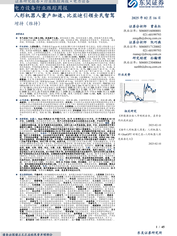【东吴证券】【20250216】电力设备行业跟踪周报:人形机器人量产加速、比亚迪引领全民智驾-45页