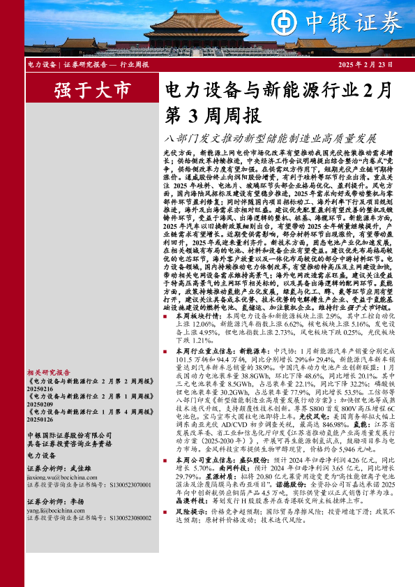 【中银证券】【20250223】电力设备与新能源行业2月第3周周报:八部门发文推动新型储能制造业高质量发展-13页
