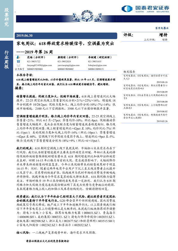 【国泰君安证券】【20190630】家电周议:618释放需求转暖信号,空调最为突出-17页