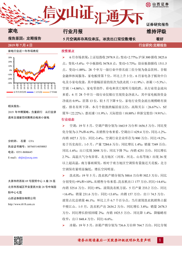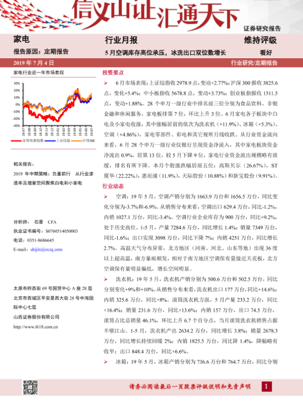 【山西证券】【20190704】20190704-山西证券-家电行业月报:5月空调库存高位承压,冰洗出口双位数增长-13页
