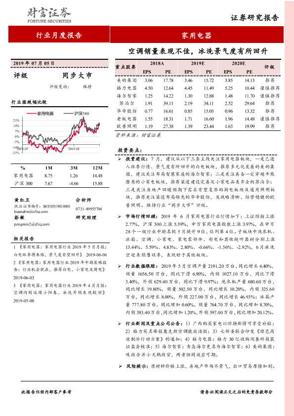 【财信证券】【20190705】家用电器行业月度报告:空调销量表现不佳,冰洗景气度有所回升-14页