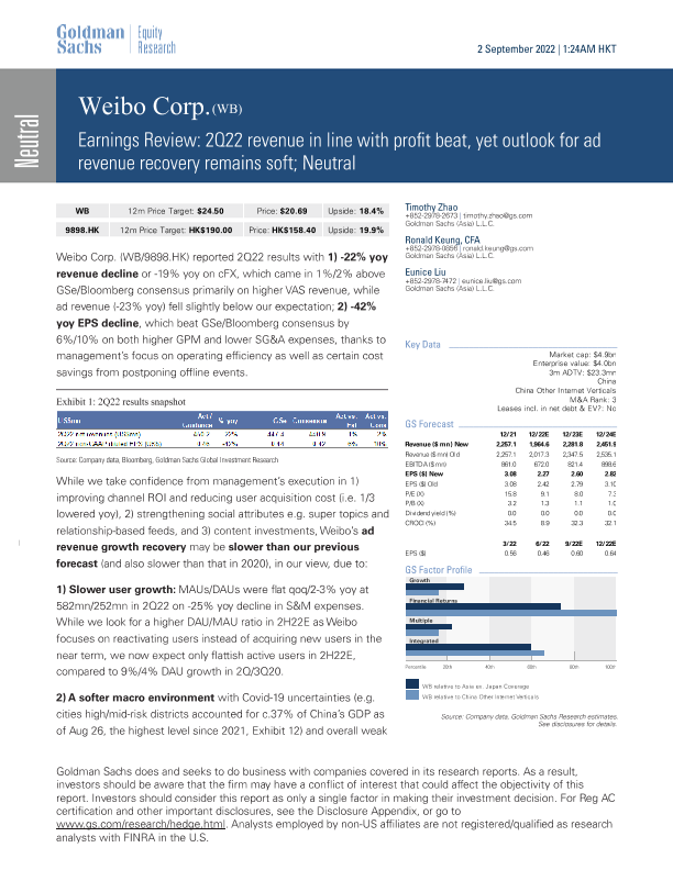 【Goldman Sachs】【20220902】Weibo Corp. 2Q22 earnings review Profit beat, yet outlook for ad revenue recovery remains soft-13页