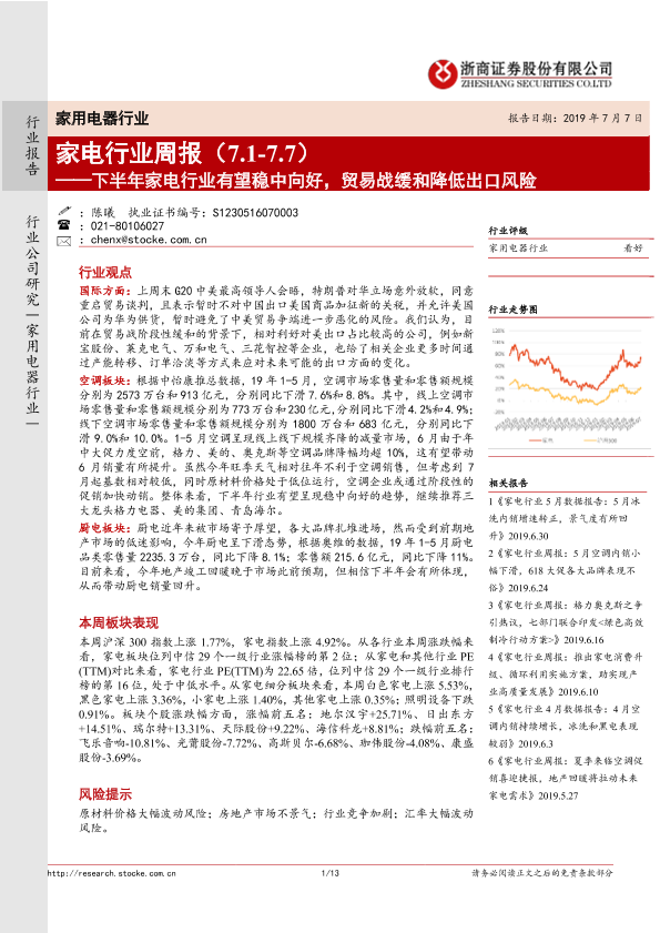 【浙商证券】【20190707】20190707-浙商证券-家电行业周报:下半年家电行业有望稳中向好,贸易战缓和降低出口风险-13页