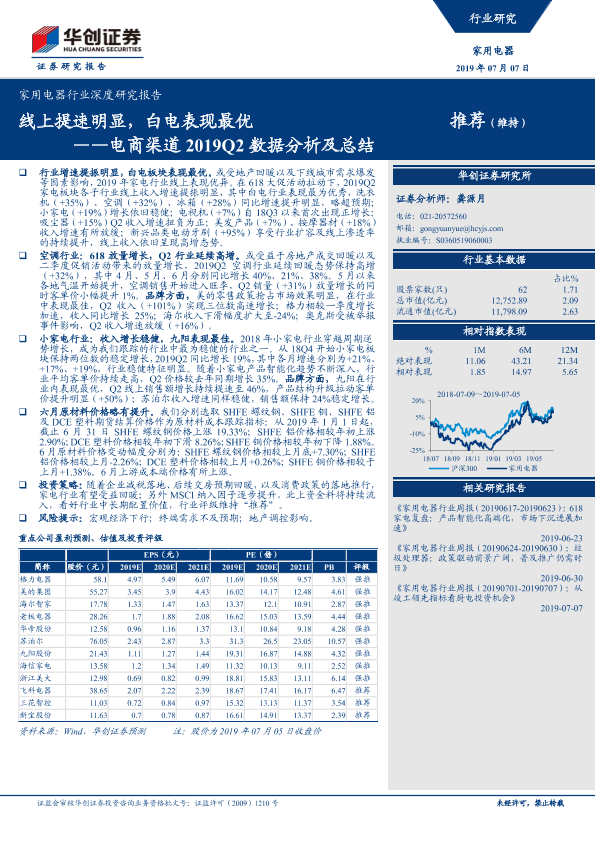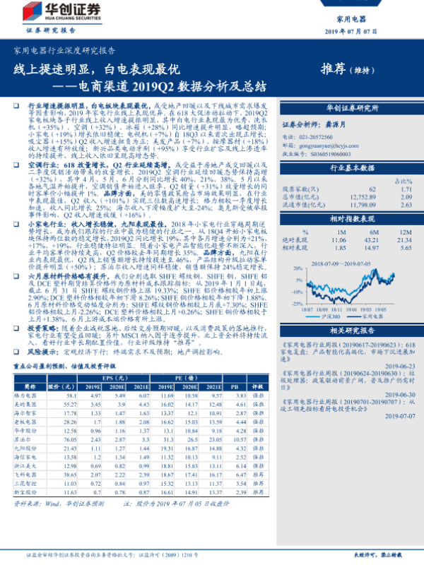 【华创证券】【20190707】家用电器行业深度研究报告:电商渠道2019Q2数据分析及总结:线上提速明显,白电表现最优-22页