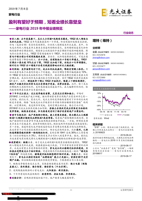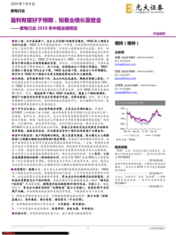 【光大证券】【20190708】家电行业2019年中报业绩预览:盈利有望好于预期,短看业绩长靠壁垒-20页